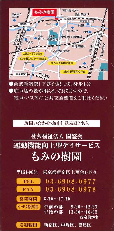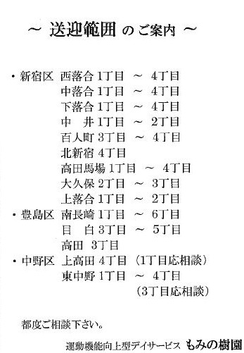 あなたの介護・リハビリ ライフ応援します。2017年8月1日より新規開設しました( もみの樹園内 1 階 )「新宿区 西落合」の皆様、新規 デイサービス新設のご案内「 特別養護老人ホーム もみの樹園 」開設しました。 ..〒115-0042 東京都北区志茂3-17-3. |
